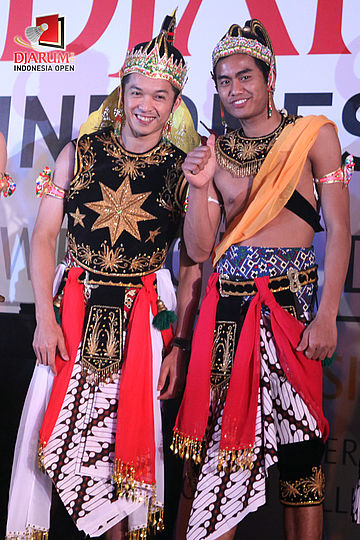 Taufik Hidayat (kiri) dan Tontowi Ahmad berpakaian seperti tokoh wayang ketika hadir di Welcome Dinner Djarum Indonesia Open 2012 di Hotel Sultan, Jakarta.