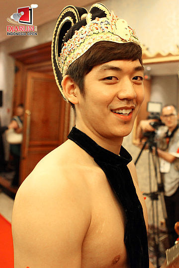 Pemain asal Korea Selatan, Lee Yong Dae menjadi perhatian pengunjung ketika berpakaian seperti tokoh wayang ketika hadir di Welcome Dinner Djarum Indonesia Open 2012 di Hotel Sultan, Jakarta.