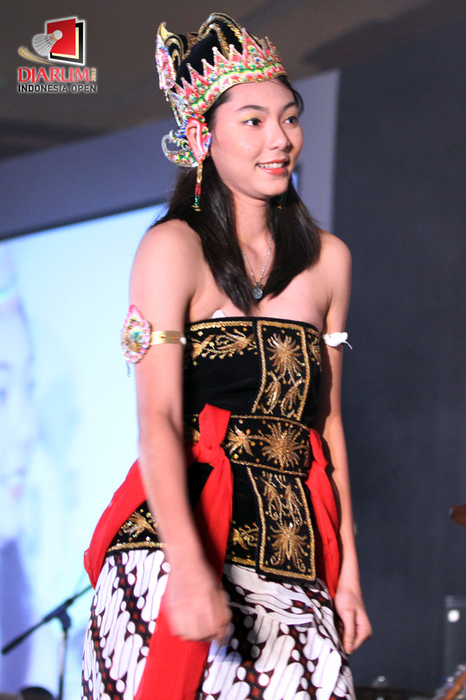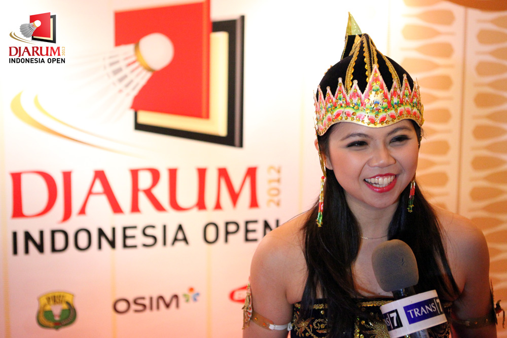 Pemain Pelatnas Indonesia, Gloria Wijaya berpakaian ala tokoh wayang ketika hadir di Welcome Dinner Djarum Indonesia Open 2012 di Hotel Sultan, Jakarta.