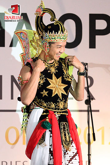 Taufik Hidayat mengenakan pakaian seperti tokoh Gatot Kaca dalam Welcome Dinner Djarum Indonesia Open 2012 di Hotel Sultan, Jakarta.