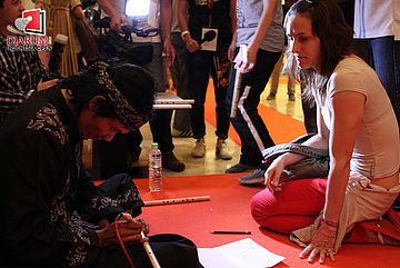 Agnese Allegrini tengah menunggu pengukir nama di suling yang diberikan kepadanya saat Welcome Dinner Djarum Indonesia Open 2012 di Hotel Sultan, Jakarta.