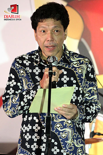 Ketua PB PBSI, Djoko Susanto tengah memberikan kata sambutan dalam Welcome Dinner Djarum Indonesia Open 2012 di Hotel Sultan, Jakarta.