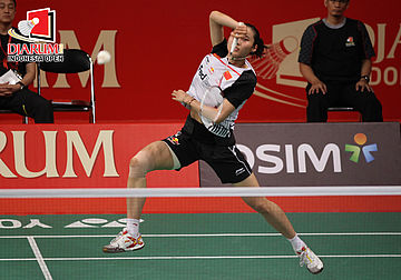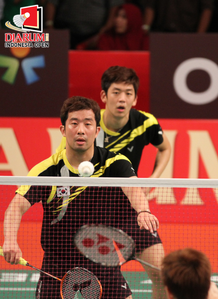 Pasangan Korea Selatan, Jung Jae Sung (depan)/Lee Yong Dae berusaha mengembalikan kok ke arah pasangan Indonesia, Gideon Markus/Agripinna.