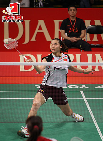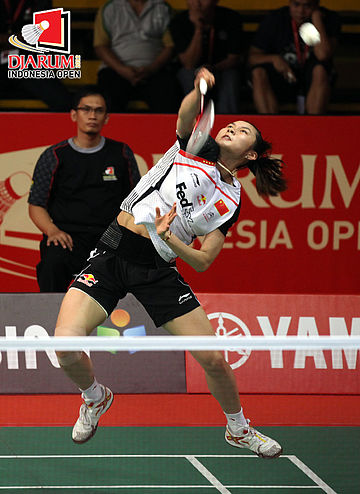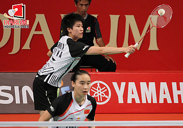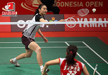 Pemain China, Wang Yihan mengembalikan kok ke arah pemain Jepang, Eriko Hirose.
