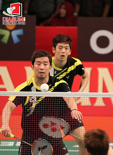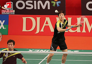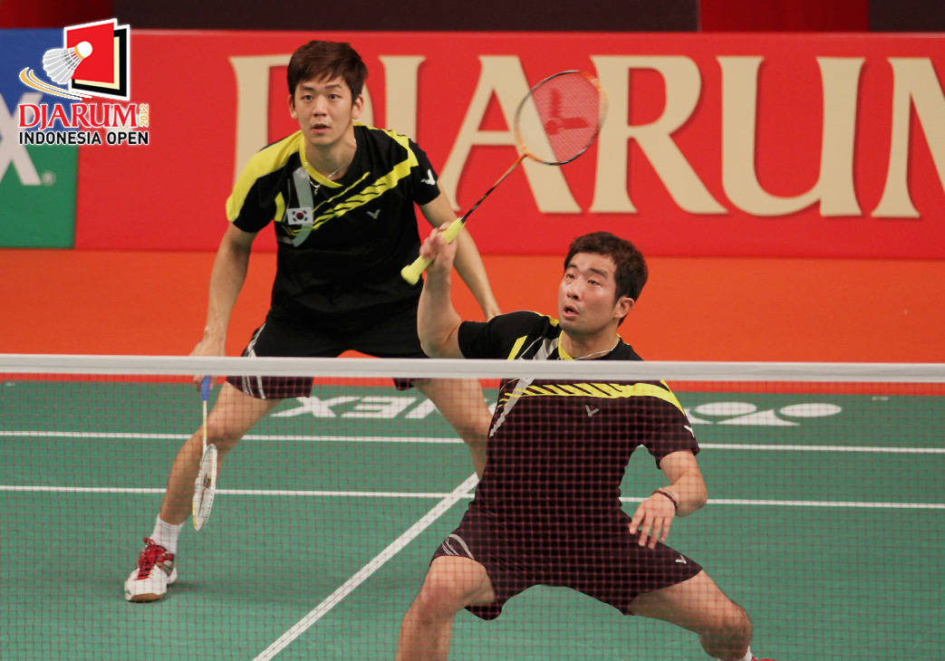 Pasangan Jung Jae Sung (depan)/Lee Yong Dae berusaha mengembalikan kok ke arah pasangan Indonesia, Gideon Markus/Agripinna.