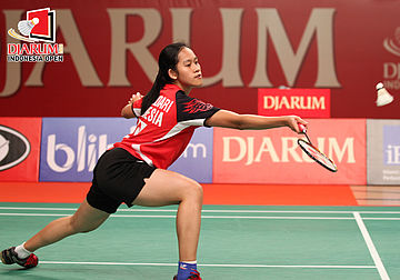 Pemain Indonesia, Aprilla Yuswandari berusaha mengembalikan kok ke arah pemain India, Saina Nehwal.