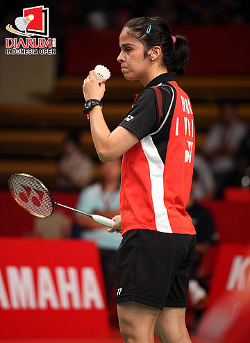Pemain India, Saina Nehwal melakukan service saat berlaga melawan pemain Indonesia, Aprilla Yuswandari.