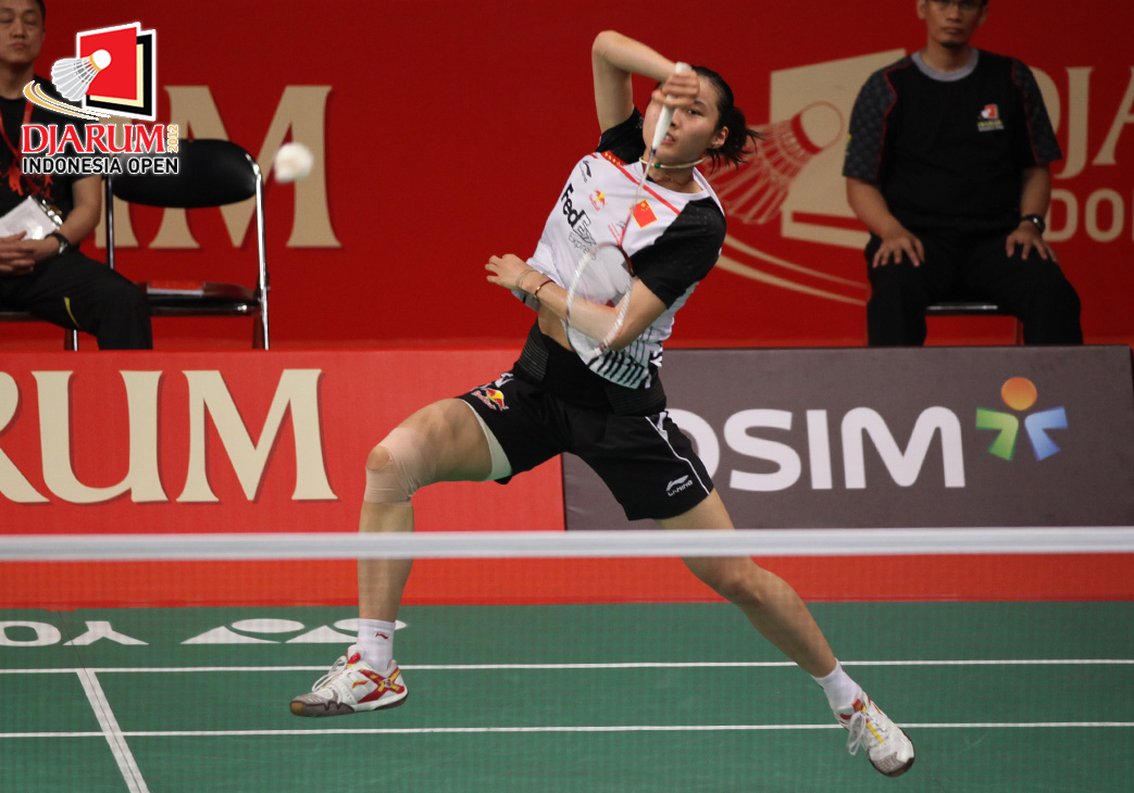 Pemain China, Wang Yihan melancarkan smash keras ke arah pemain Jepang, Eriko Hirose.