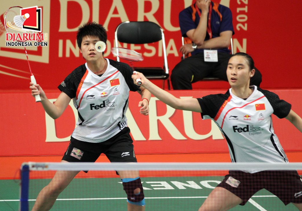 Pasangan China, He Hanbin (belakang)/Bao Yixin berusaha mengembalikan kok ke arah pemain China Xu Chen/Ma Jin.