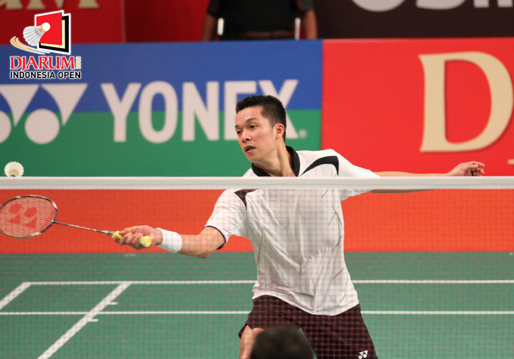 Pemain Indonesia Taufik Hidayat, berusaha mengembalikan kok ke arah pemain Indonesia, Sony Dwi Kuncoro.