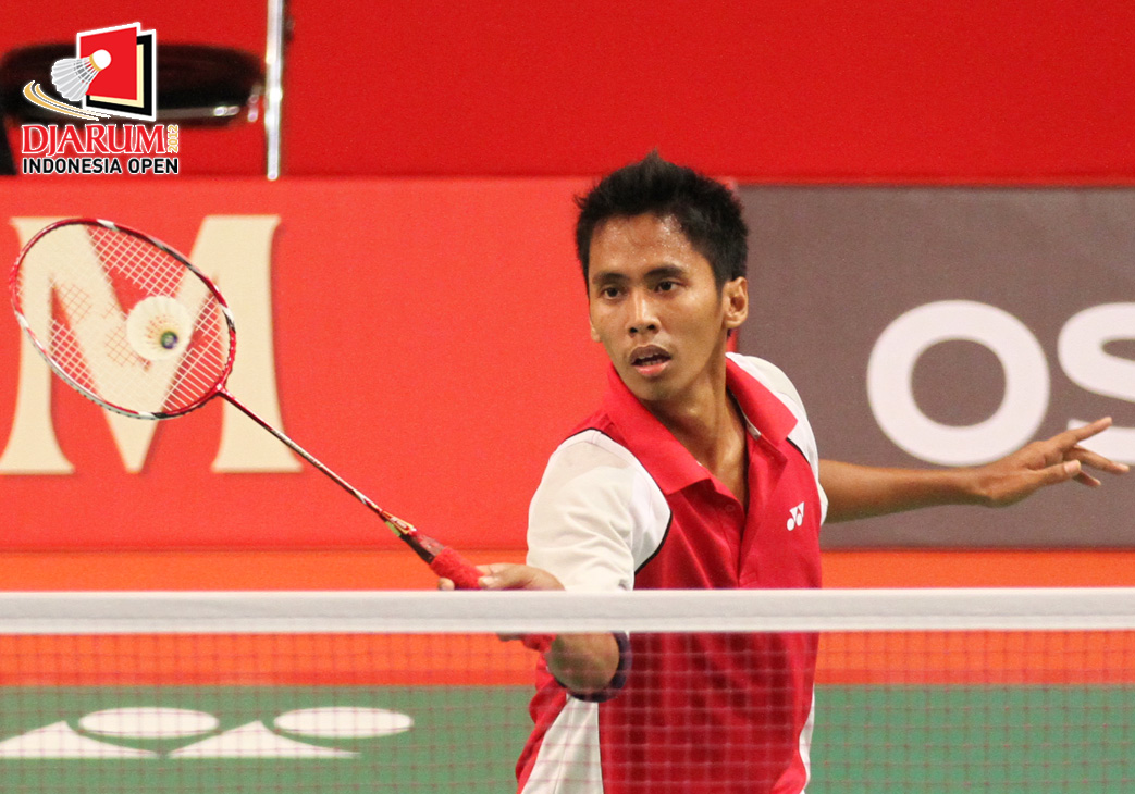 Pemain Indonesia, Simon Santoso kala berlaga melawan pemain Hong Kong, Wong Wing Ki.