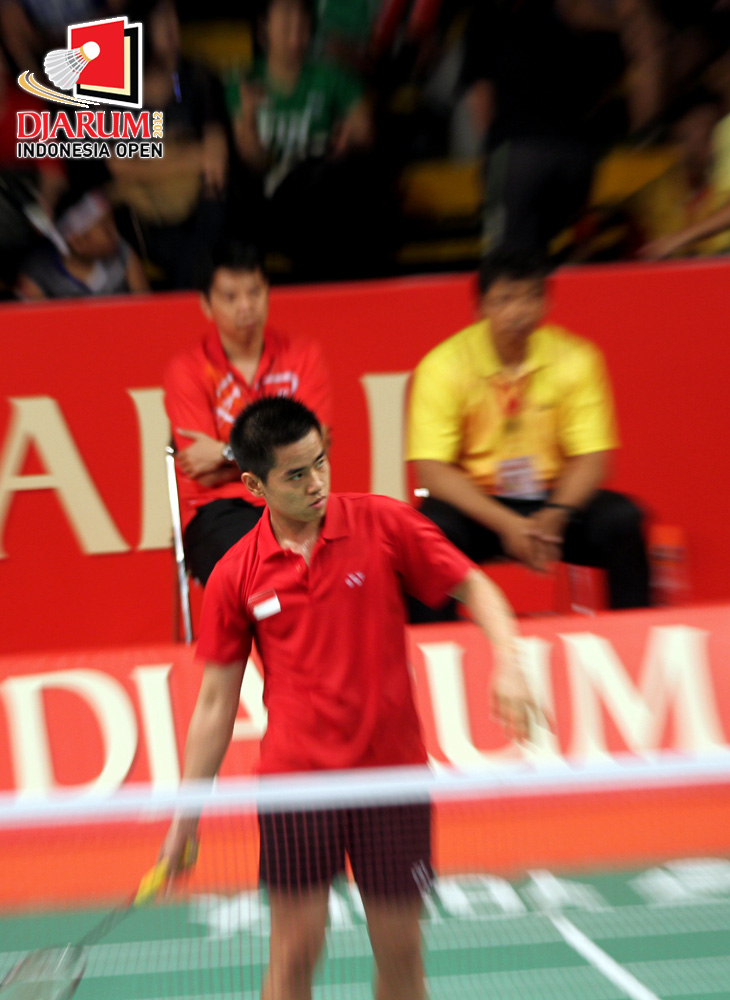 Pemain Indonesia, Simon Santoso berusaha mengembalikan kok ke arah pemain Hong Kong, Wong Wing Ki.