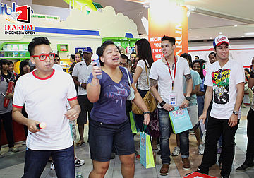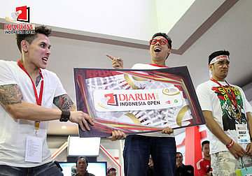 Personel Project P, Udjo, dan Tike Pangabean ketika berkunjung ke booth merchandise Djarum Indonesia Open 2012.