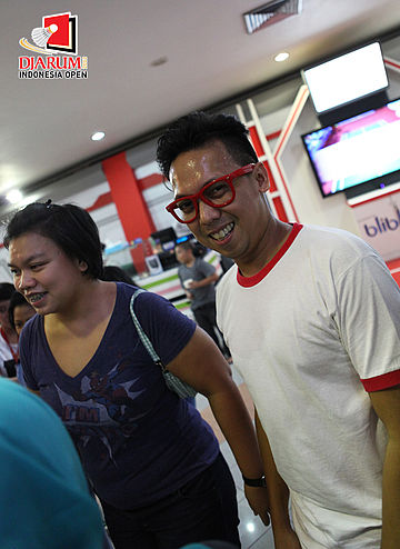 Ekspresi personel Project P, Udjo (kiri) ketika tengah menyaksikan pertandingan Djarum Indonesia Open 2012