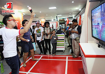 Selebriti Indonesia (ki-ka) Bimo, Udjo, dan Mario Lawalata tengah mencoba fasilitas augmented reality.