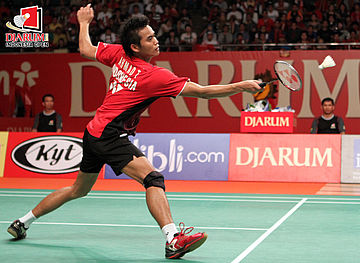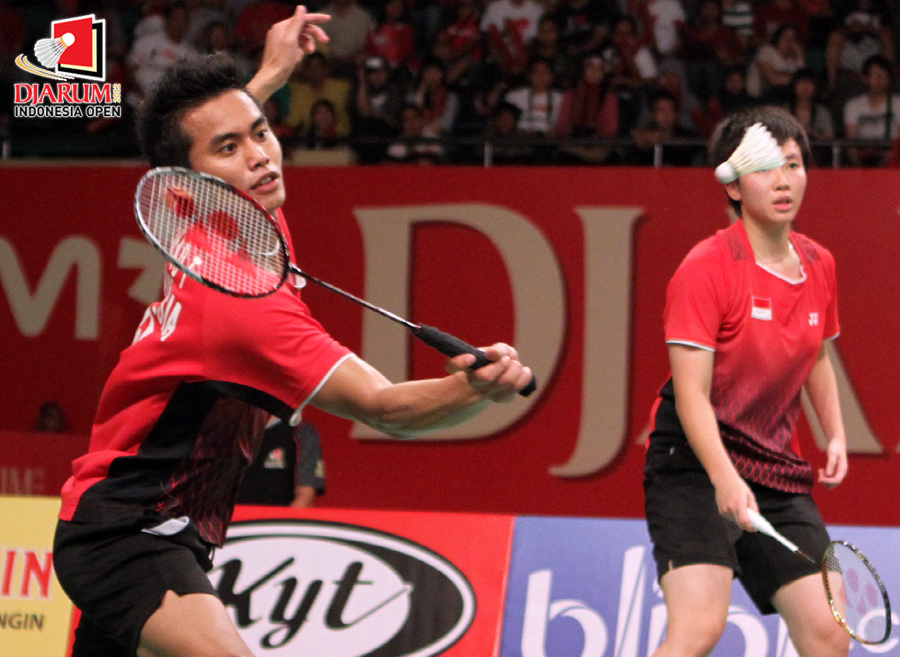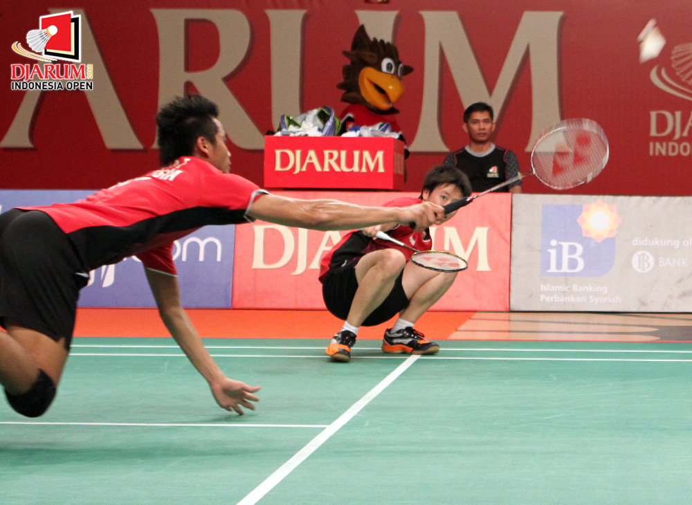 Pemain Indonesia, Tontowi Ahmad berusaha mengembalikan kok ke arah pasangan China, Xu Chen/Ma Jin.