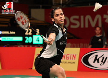 Pemain Korea Selatan, Sung Ji Hyun berusaha mengembalikan kok ke arah pemain India, Saina Nehwal.