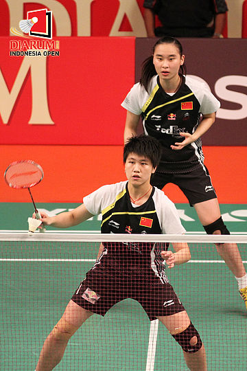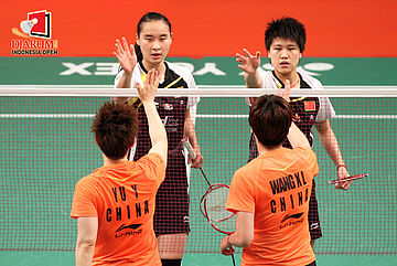 Pasangan China, Zhong Qianxin/Bao Yixin tengah mengembalikan kok ke arah rekan senegaranya Wang Xiaoli/Yu Yang.