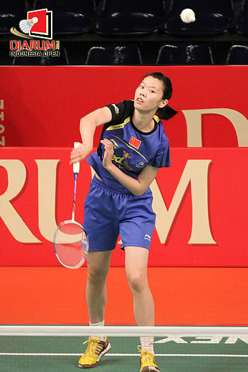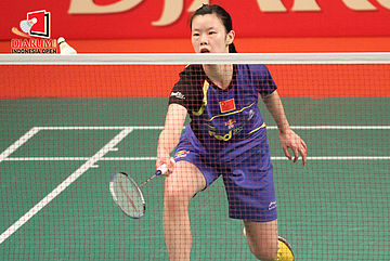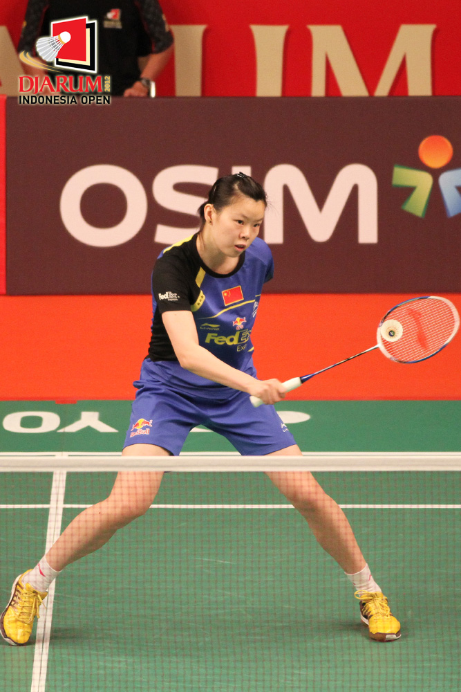 Pemain China, Li Xuerui berusaha mengembalikan kok ke arah rekan senegaranya, Wang Yihan.
