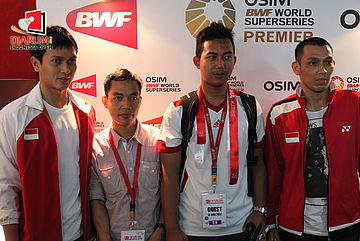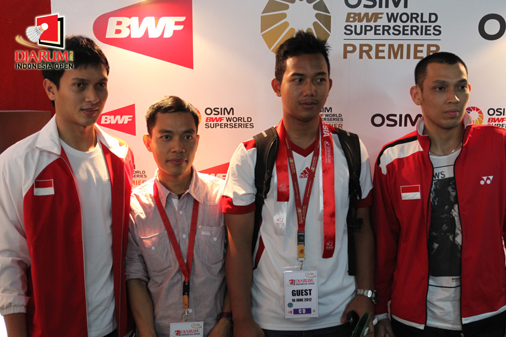 Pasangan Indonesia, Mohammad Ahsan (kiri) dan Bona Septano (kanan) tengah berfoto bersama dengan pangunjung.
