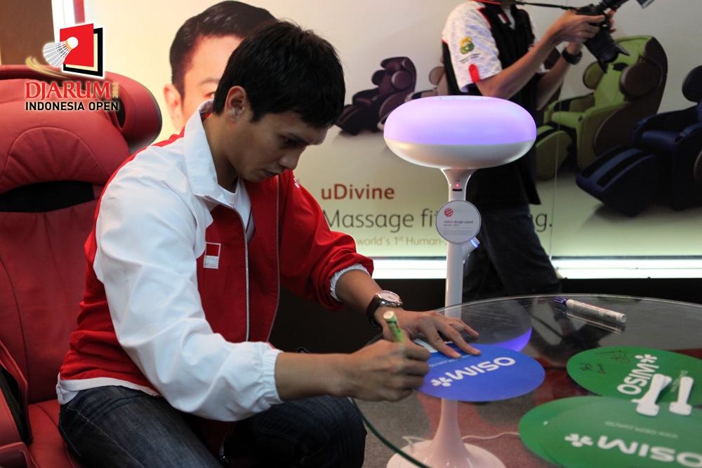 Pemain Indonesia,Mohammad Ahsan memberikan tanda tangan ketika tengah melakukan meet and greet.