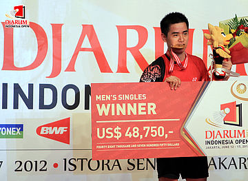 Juara tunggal putra DIO 2012, Simon Santoso dan runner up, Du Pengyu berpose bersama dengan panitia Djarum Indonesia Open 2012.