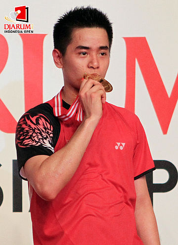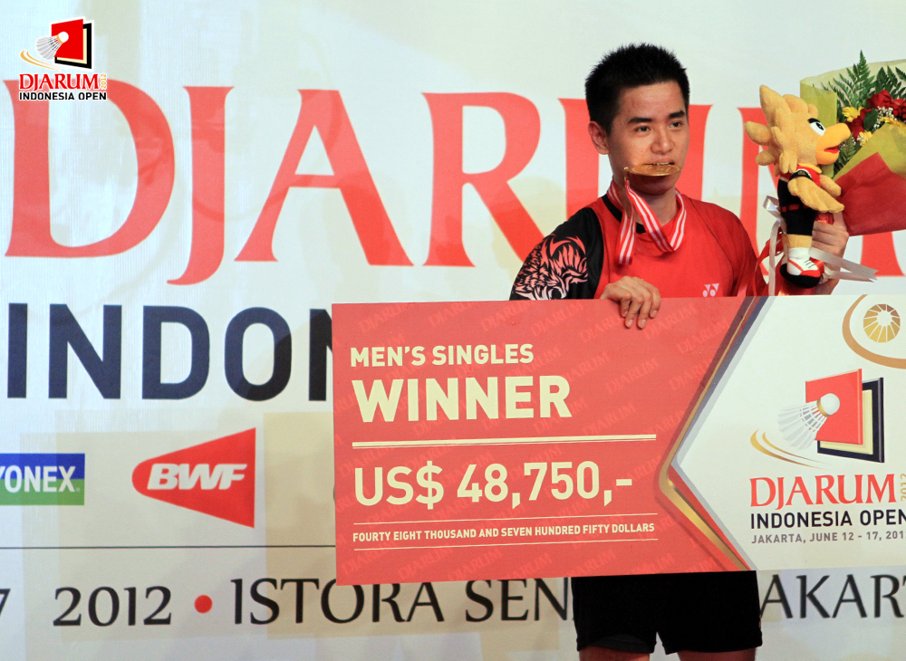 Simon Santoso menggigit medali usai menjadi juara tunggal putra Indonesia Open 2012.