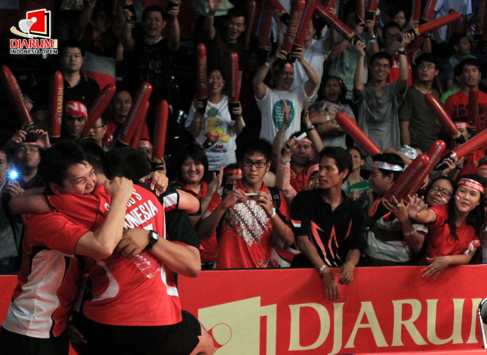 Ekspresi suporter Indonesia ketika menyaksikan final Djarum Indonesia Open 2012.