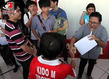 Panitia lelang memberikan sebuah raket Taufik Hidayat kepada pemenang lelang.