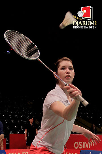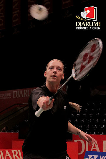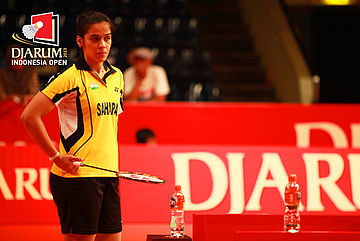 Saina Nehwal (India) saat memperhatikan rekan-rekannya berlatih di Nations Pride Arena, Istora Senayan.
