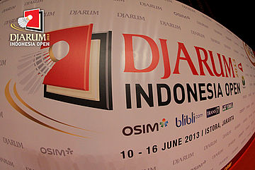 Giant Banner Djarum Indonesia Open Super Series Premier 2013 terpampang di samping Nations Pride Arena, Istora Senayan, Jakarta.