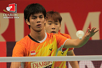 Andrei Adistia/Markus Fernaldi Gideon (Indonesia) melepaskan serve.