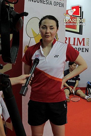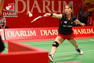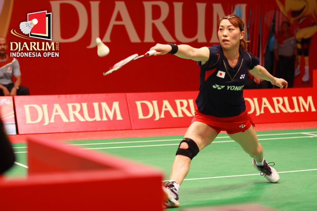 Kaori Imabeppu (Jepang) mengembalikan shuttlecock ke arah Yu Sun (China).