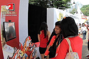 Salah satu pengunjungn saat menikmati sarana photobooth yang tersedia di booth Djarum Official Merchandise.