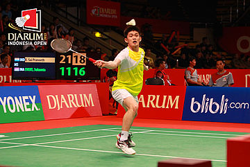 Evert Sukamta (Indonesia) mengembalikan shuttlecock ke arah Sai Praneeth (India).