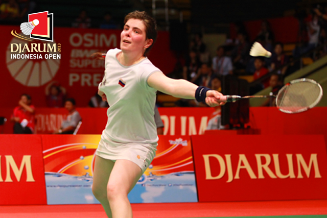 Febby Angguni (Indonesia) berhasil menggapai drop smash yang dilepaskan Anna Astrakhantseva (Rusia).