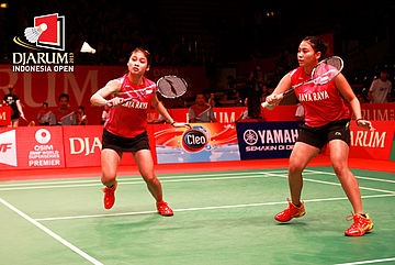 Pia Zebadiah/Rizki Amelia (Indonesia) bersiap mengembalikan shuttlecock ke arah Heather Olver/Kate Robertshaw (Inggris).