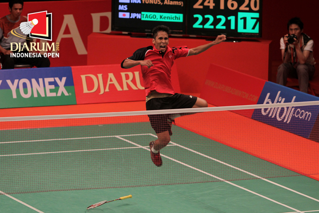 Ekspresi dan selebrasi Alamsyah Yunus (Indonesia) saat memenangkan pertandingan atas Kenichi Tago (Jepang).