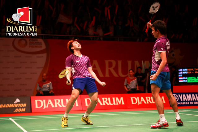 Ekspresi dan selebrasi Andrei Adistia/Markus Fernaldi Gideon (Indonesia) setelah berhasil mengalahkan Thien How Hoon/Wee Kiong Tan (Malaysia).