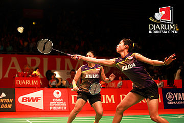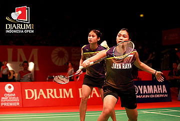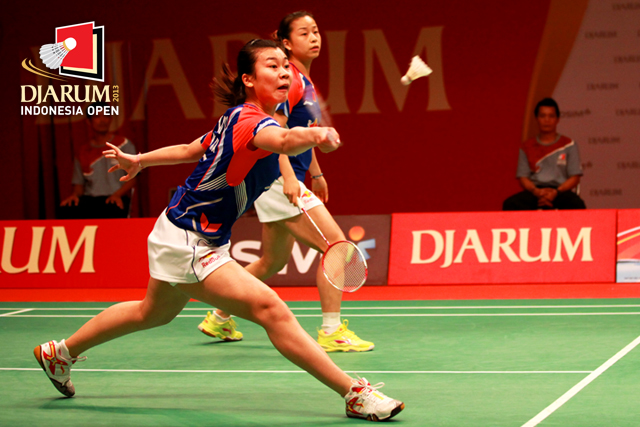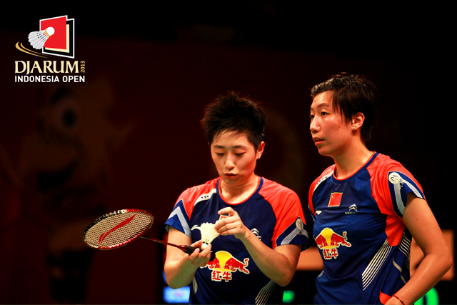 Pasangan ganda putri peringkat satu dunia, Wang Xiaoli/Yu Yang (China) terlihat saling berdiskusi sebelum melakukan serve.