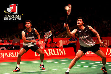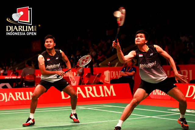 Ricky Karanda Suwardi/Muhammad Ulinnuha (Indonesia) berhasil menghadang serangan yang dilepaskan pasangan asal Jepang, Takeshi Kamura/Keigo Sonoda.