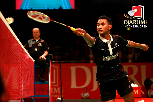 Tommy Sugiarto (Indonesia) menyambar pengembalian tanggung dari Wong Wing Ki (Hongkong).