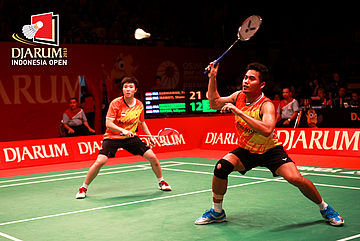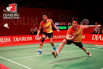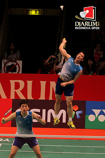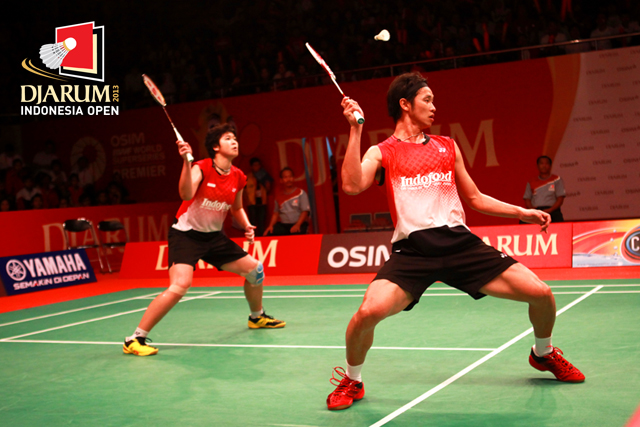 Ko Sung Hyun/Lee Yong Dae (Korea Selatan) bersiap melepaskan smash.