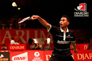 Tommy Sugiarto (Indonesia) mengembalikan shuttlecock ke arah Wong Wing Ki (Hongkong).