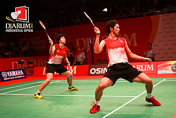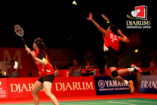 Muhammad Rijal/Debby Susanto (Indonesia) bersiap melepaskan smash ke arah pasangan ganda campuran Inggris, Chris Langridge/Heather Olver.