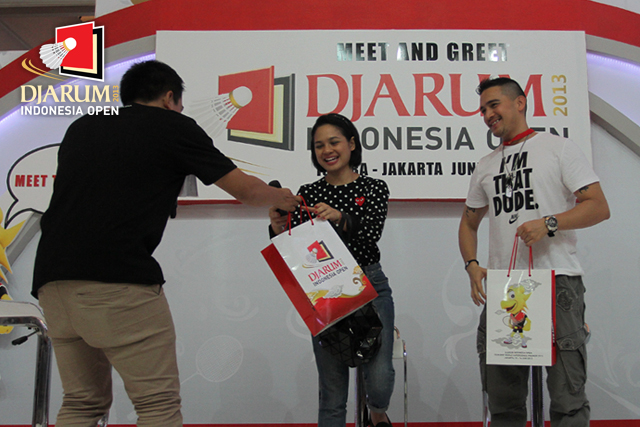 Andien (tengah) dan Mario Lawalata mendapatkan bingkisan usai melakukan meet and greet di Djarum Lounge.