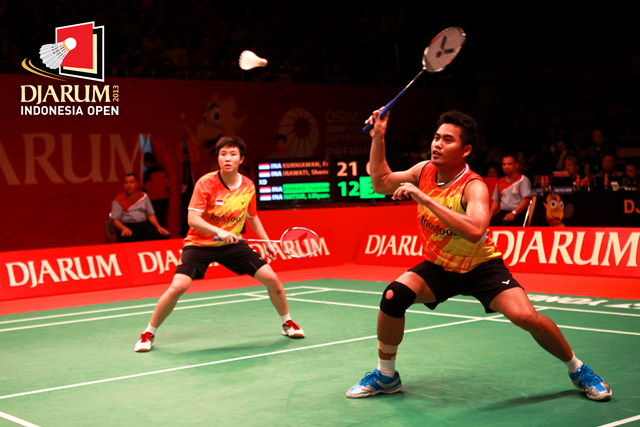 Tantowi Ahmad/Liliyana Natsir (Indonesia) bersiap mengembalikan shuttlecock ke arah Fran Kurniawan/Shendy Puspa (Indonesia).