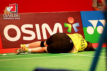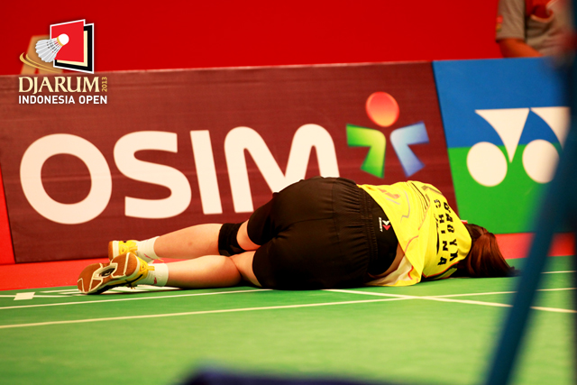 Bao Yixin (China) terjatuh usai menahan serangan bertubi-tubi yang dilepaskan pasangan ganda putri Indonesia, Nitya Krishinda Maheswari/Greysia Polii.
