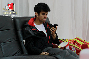 Ajay Jayaram (India) terlihat sedang memainkan gadget-nya di player lounge.