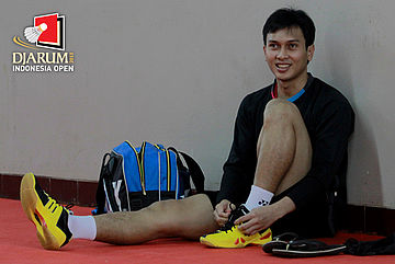 Mohammad Ahsan (Indonesia) sedang mengikat sepatu sebelum melakukan pemanasan.